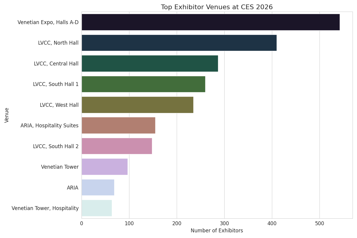 The distribution of exhibitors across the various halls highlights the sheer scale and thematic organization of CES 2026. As you can see in the bottom-right "Top Halls" panel of our feature image, specific venues are hubs for different types of innovation: